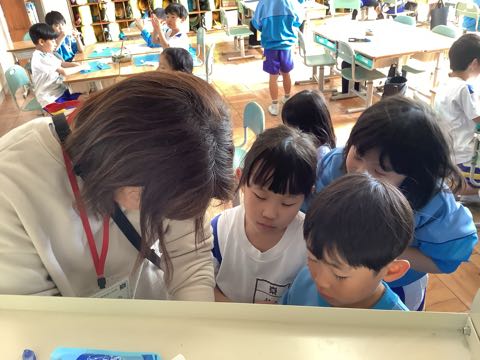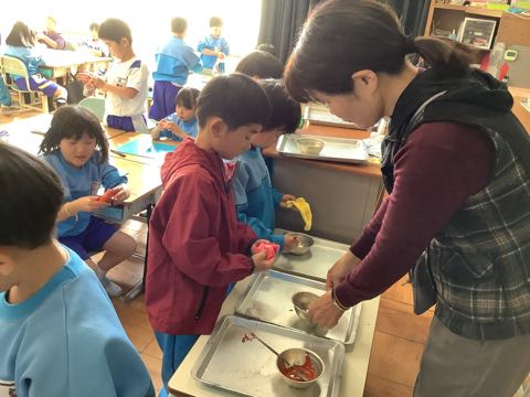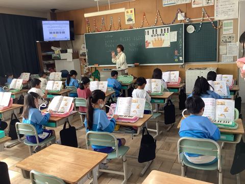 1年生は図工で紙粘土工作を、2年生は音楽で鍵盤ハーモニカを演奏していました。