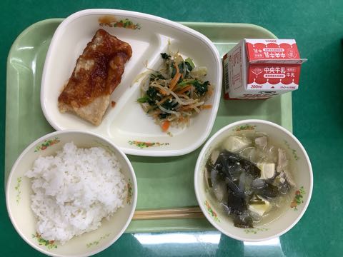 ご飯 牛乳ヤンニョムチキン小松菜のナムル春雨スープ