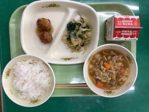 ご飯 牛乳ごぼう入りつくね2個キャベツと小松菜のごまあえ枝豆じゃが