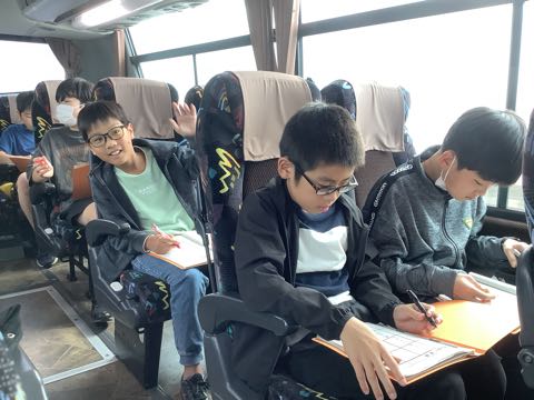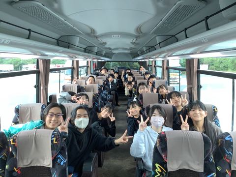 バスの中です。DVDやビンゴ、レクをして楽しんでいます。