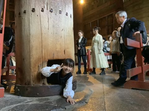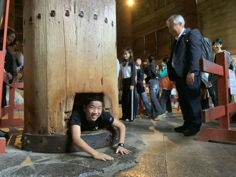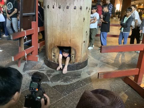 穴くぐりをしました。大仏の鼻の穴と同じくらいの大きさだそうです。柱の穴をくぐると頭がよくなるご利益があるそうです。
