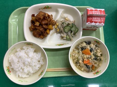 ご飯 牛乳鶏肉とさつま芋のからめ煮ごぼうサラダかき玉汁