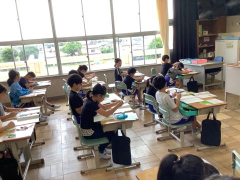 1年生は書き取りの学習を、3年生はコンパスを使った算数を行っていました。