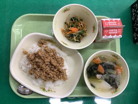 ご飯 牛乳ビビンバ三色野菜のナムルワンタンスープ