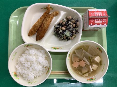 今日の給食です。今日のししゃもフライ2尾は、11月11日から来ているかもと勝手に想像してしまいます…。