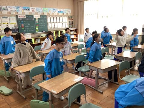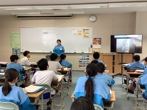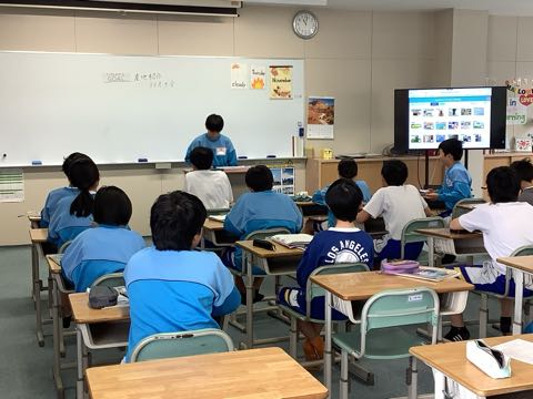 6年生は中学校につながる英語の授業。個別のスピーチを行っています。