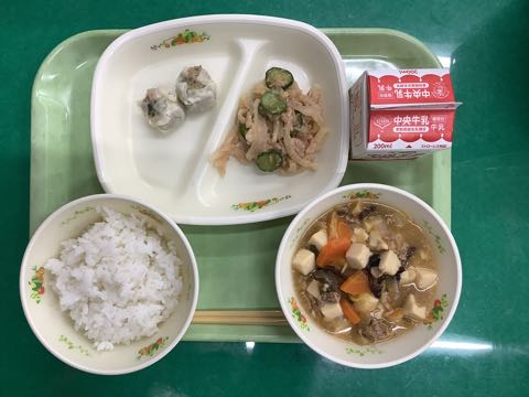 ご飯 牛乳野菜入りしゅうまい2個大根の中華サラダ豆腐の中華風煮