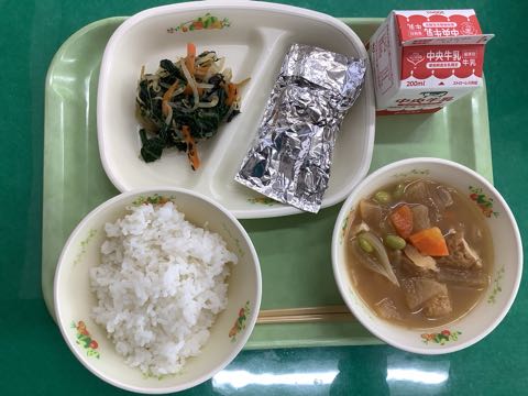ご飯 牛乳たらのみそマヨ銀紙焼きほうれん草ともやしののりあえ生揚げのうま煮