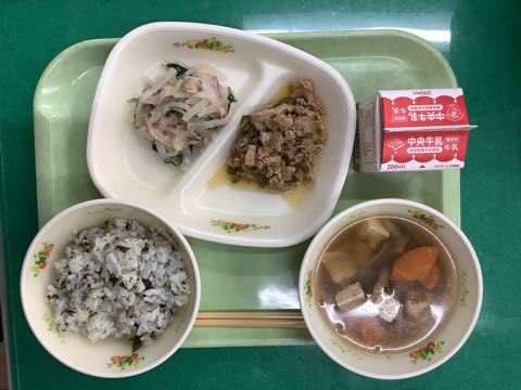 わかめご飯 牛乳豚肉のしょうが炒め大根と水菜のサラダ鶏団子汁