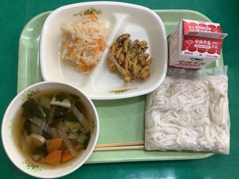 今日の給食です。・牛乳・白玉うどん・五目うどんの汁・かき揚げ・切り干し大根のはりはり和え