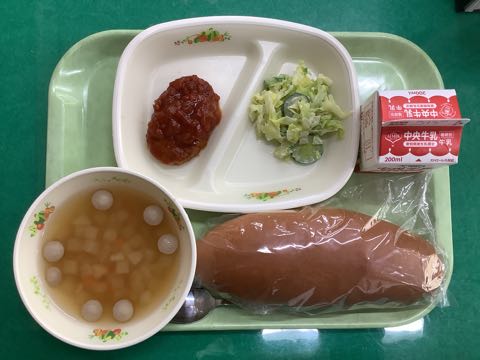 ロールパン 牛乳トマトソースハンバーググリーンサラダマセドアンスープ