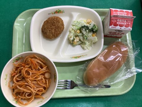 小型ロールパン 牛乳ナポリタンスパゲッティかぼちゃコロッケブロッコリーのサラダ