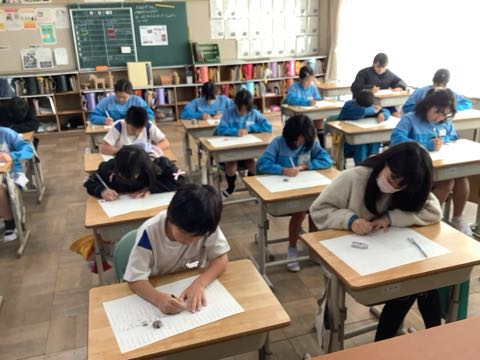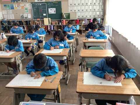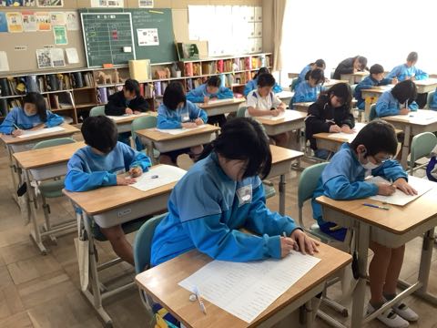 子どもたちは3時間授業でした。4年生は国語の努力賞テストでした。