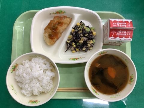 ご飯 牛乳白身魚の野菜あんかけひじきと枝豆のサラダ冬野菜のみそ汁