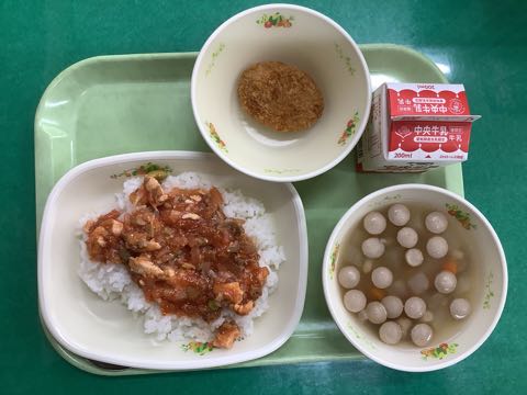 ご飯 牛乳チキンライスの具かつおのメンチカツポトフ風スープ