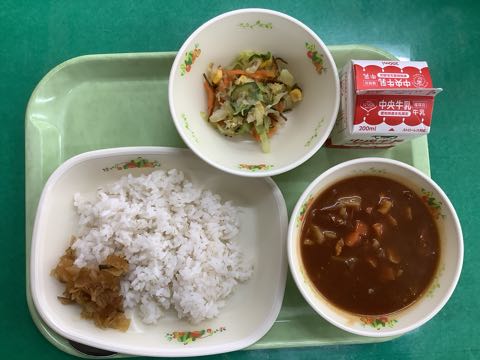 麦ご飯 牛乳ハヤシシチュー元気サラダ福神漬け