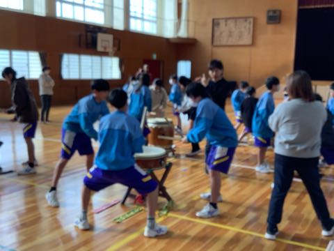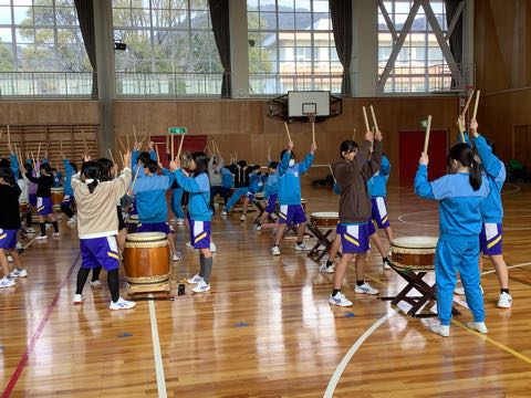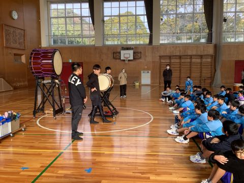 今日は西尾市の事業「アーティストインスクール」がありました。5、6年生が体育館で和太鼓をたたきました。