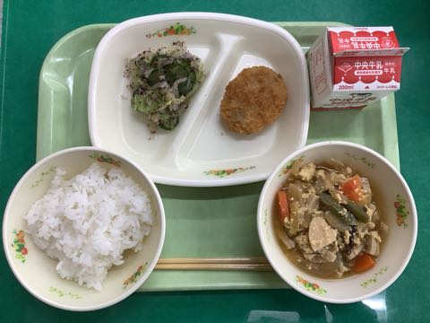 ご飯 牛乳かつおメンチカツゆかりあえ具だくさんかきたま汁(←高野豆腐の卵とじから変更)