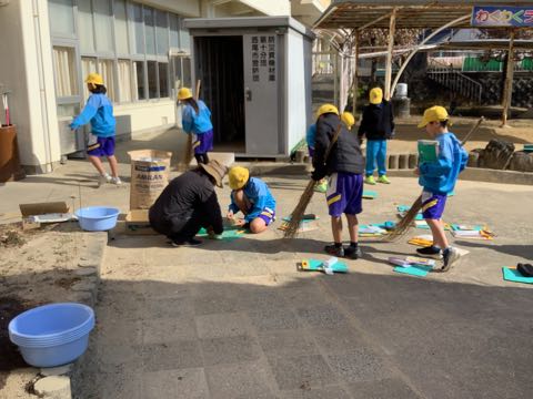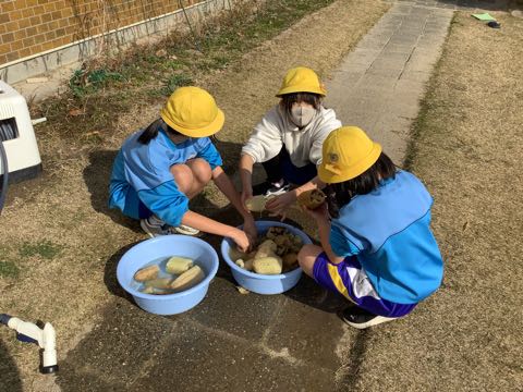 午後は元気に外遊び。運動場は児童でいっぱい。4年生は収穫したヘチマでタワシ作りをしていました。