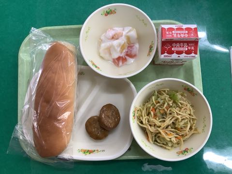 愛知の米粉パン 牛乳碧南焼きそば白ごまつくね2個いちごゼリーのヨーグルトあえ