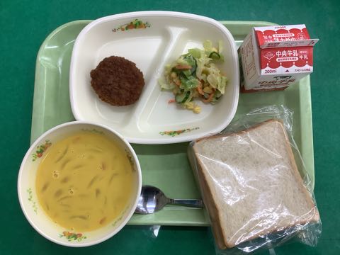 スライスパン 牛乳ソースメンチカツコールスローサラダパンプキンスープ