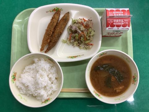 ご飯 牛乳ししゃもフライの甘辛だれ2尾ゆかりあえ大根のみそ汁