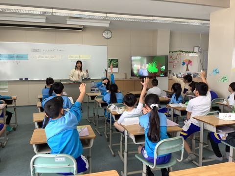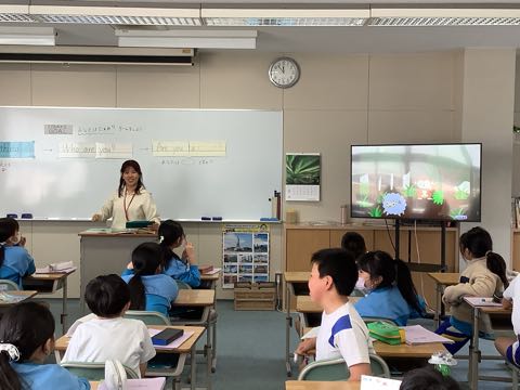イングリッシュルームでは、3年生が「隠れている動物当てクイズ」を英語で行っていました。