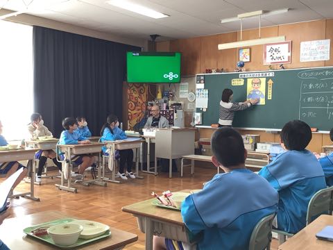 給食の時間に6年生の食育指導があり、栄養教諭の話を聞きながら「朝食を食べることの大事さ」について学習しました。