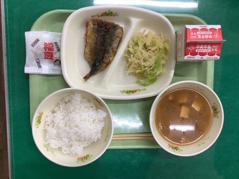 ご飯 牛乳いわしのかば焼きたくあんあえさつま汁節分豆