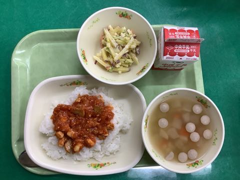 ご飯 牛乳チキンライスの具さつまいものチーズサラダポトフ風スープ