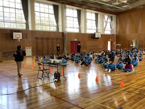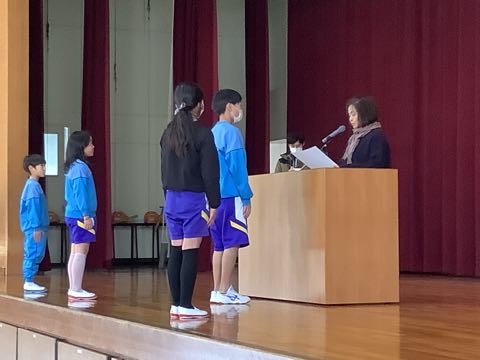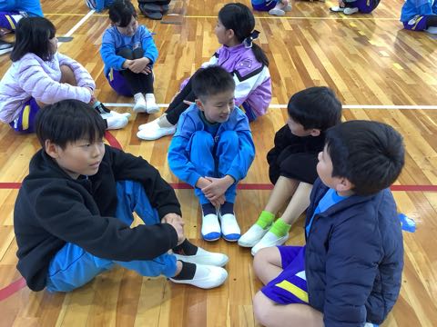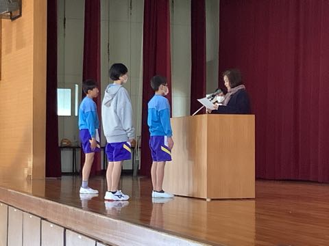 午後からは全校集会がありました。今日は新しい通学班で並んでやまびこタイムを行いました。
