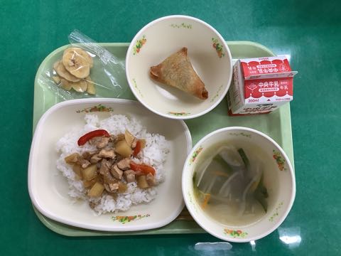 ご飯 牛乳鶏肉のアドボサモサ牛肉のフォーバナナチップス