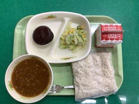 ソフトめん 牛乳カレーソースコーンサラダ豆乳ココアカップケーキ