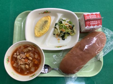 ミルクロールパン 牛乳ポークビーンズほうれん草オムレツ小松菜とキャベツのレモンあえ