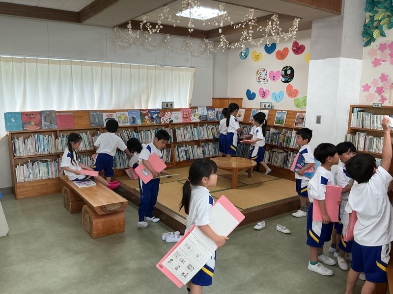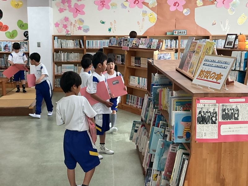 1年生は運動会練習のあと、図書館の利用の仕方について学習しました。