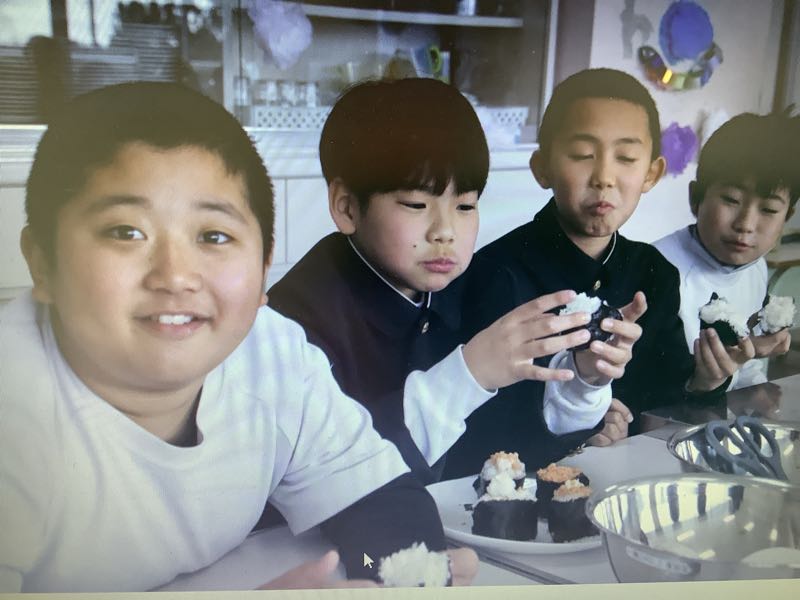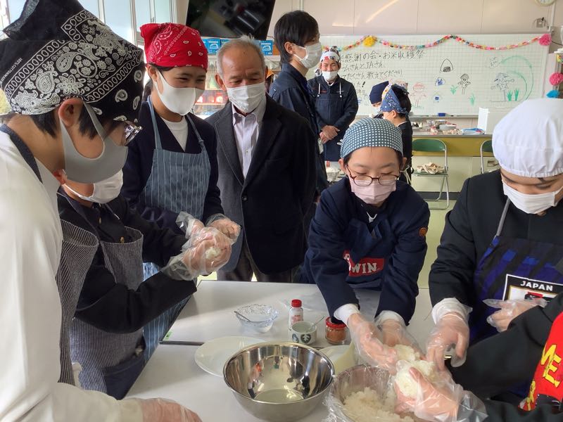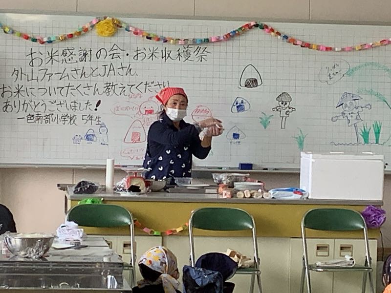 5年生が待ちに待った収穫祭をしました。お世話になった地元のお米農家の方やJAの方と一緒に収穫したお米をおにぎりにしてみんなで食べました。おにぎりに海苔を巻きました。海苔は保護者の方が寄付してくださいました。お米も海苔もとてもよい香りがしました。とても楽しい会になりました。