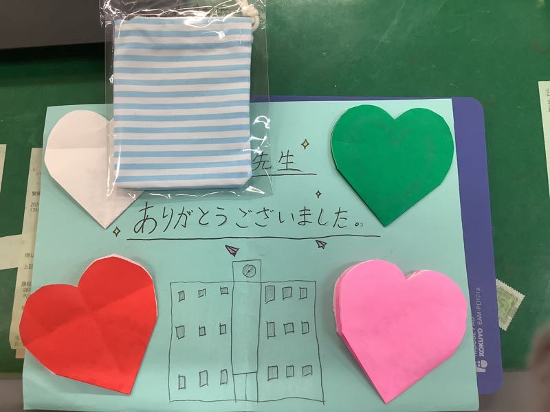 今日、6年生が職員に向けて感謝の会を開いてくれました。心のこもったメッセージカードと手作りの巾着をくれました。成長した姿がとても嬉しかったです。あと少し卒業まで大事に過ごします。