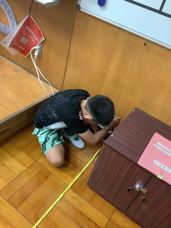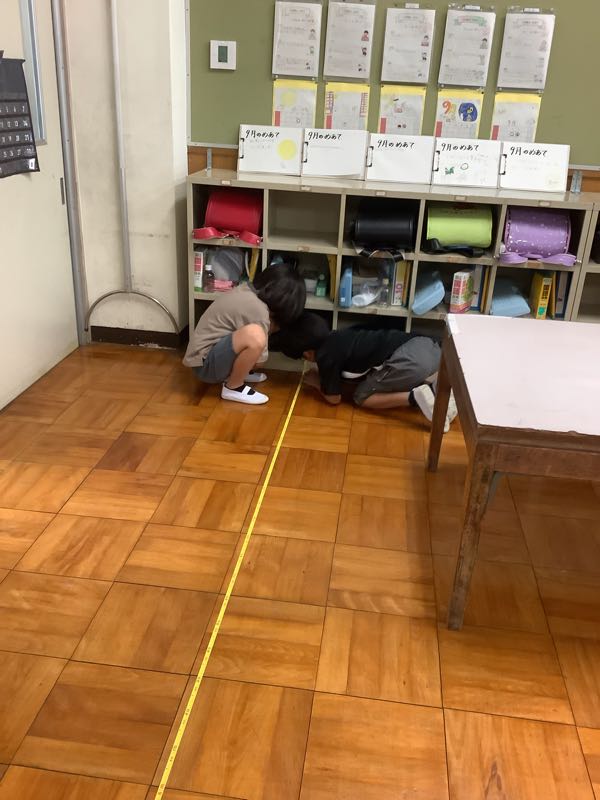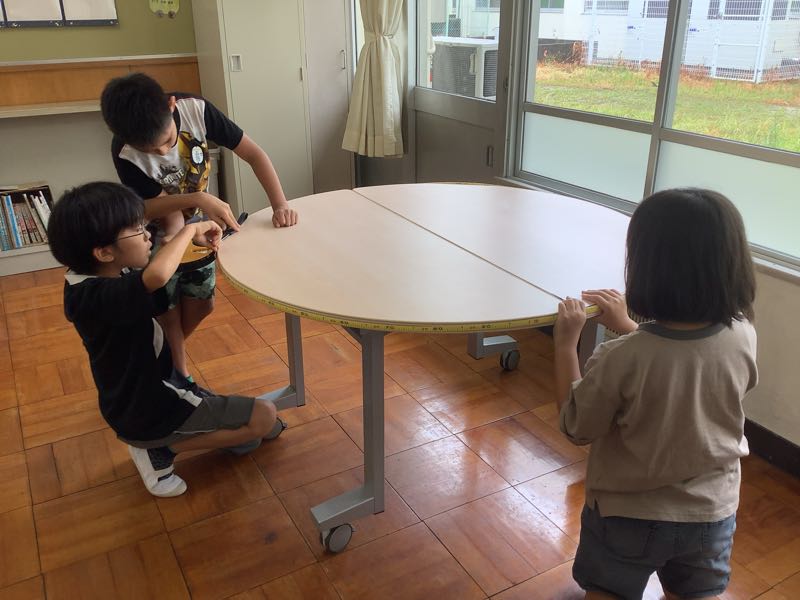 ひまわりの3年生は、算数の授業で長さの学習に取り組んでいます。今日の授業では、巻き尺を使って教室の縦と横の長さを測ったり、巻き尺の特徴を生かして丸いテーブルの周りの長さを測ったりしました。丸いところを測るのは難しかったですが、3人で協力して測ることができました。