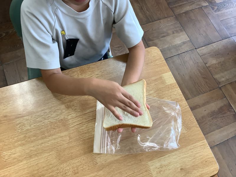 さらにその後、しっかり汚れた手をそのまま食パンにスタンプ‼︎バイ菌を目で見る学習に使います。どうなっているか、1週間後が楽しみです。