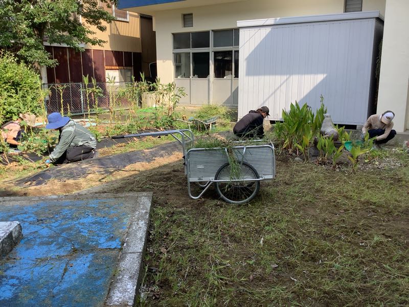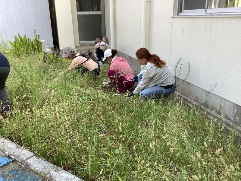 PTA奉仕作業では、普段手をつけられない家庭科室裏の草取りを行いました。大きく伸びていた草がなくなり、すっきりしました。ありがとうございました。