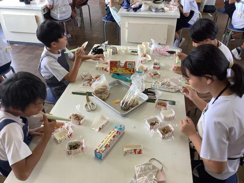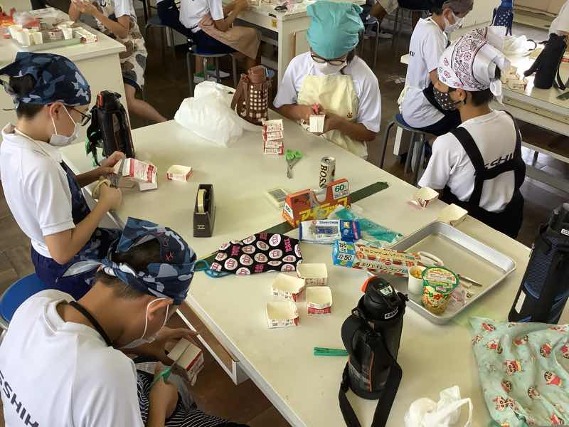金曜日に防災クッキングを行いました!牛乳パックを使って、お皿やスプーンを作りました!栄養満点リゾット、和風のむしケーキ、さばの味噌煮とワカメ和え、誰でも簡単ポテサラを作りました!どれも簡単に作ることができて、美味しかったです!とても勉強になりましたね♪
