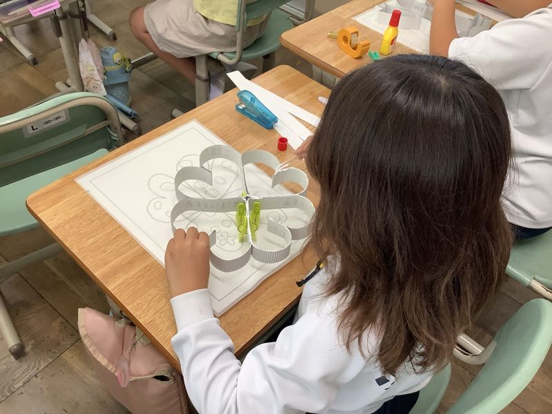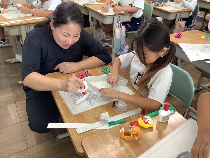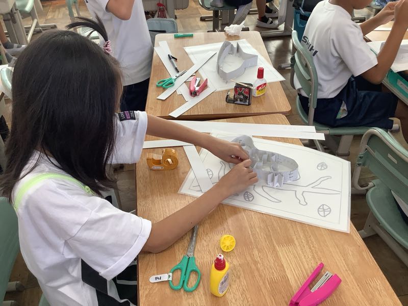 3年生は図工で「光と色のファンタジー」の作品作りに取り組んでいます。今日はホッチキスやセロテープを使って、下絵に合わせてボール紙で形を作りました。初めてホッチキスを使うという子も上手に使えるようになってきました。完成が楽しみです!