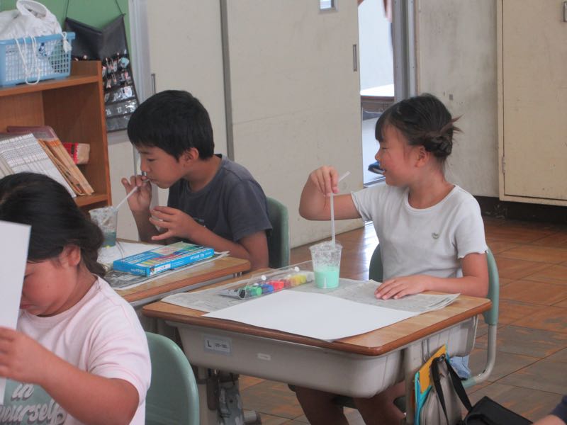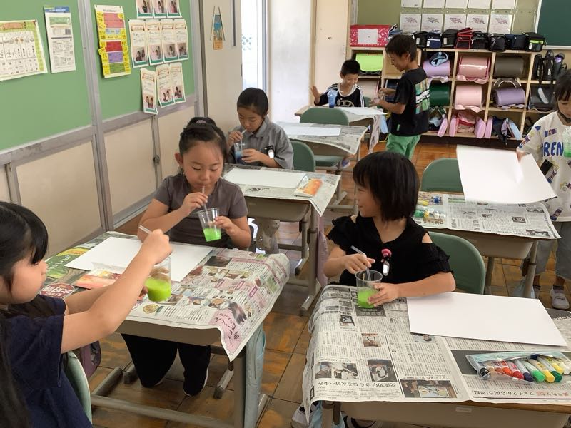 今日の図工は、息を吹き込み"ぶくぶく"させた泡で、紙に模様をつけ、試行錯誤しながら楽しんで取り組みました!できた模様が何に見えるかを考えて、模様を生かした作品を作りました!