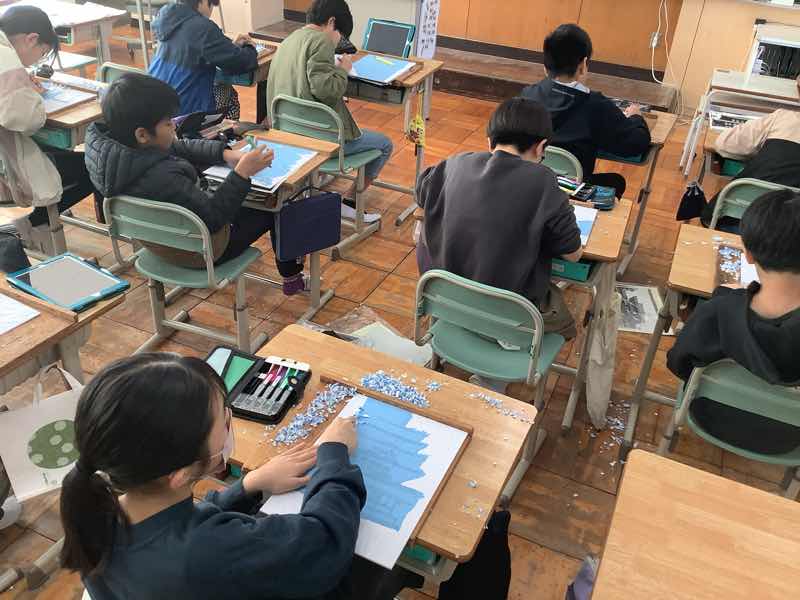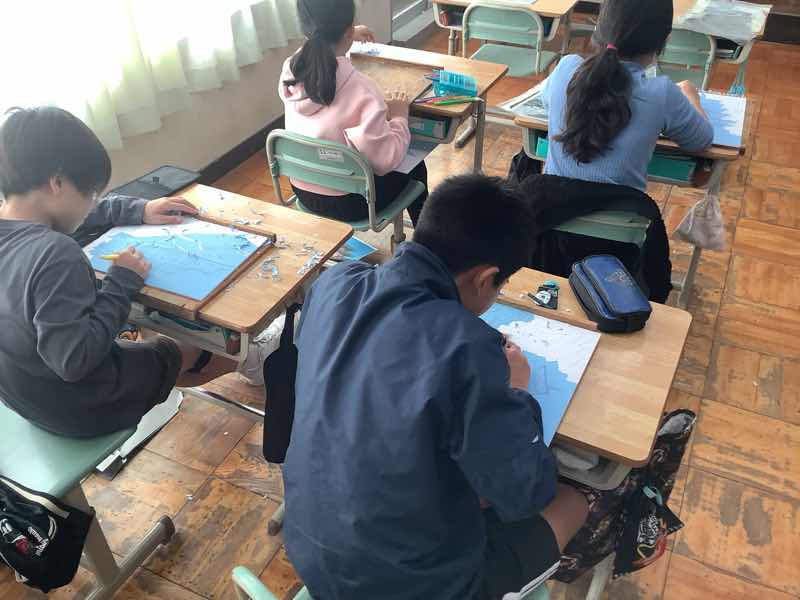 版画の制作に取りかかっています!修学旅行で訪れた仏閣をテーマに、建物の細かな形や模様を丁寧に表現しています。細い線を何度も確認しながら、彫刻刀を真剣に動かす子供達が見られました。完成が楽しみです!