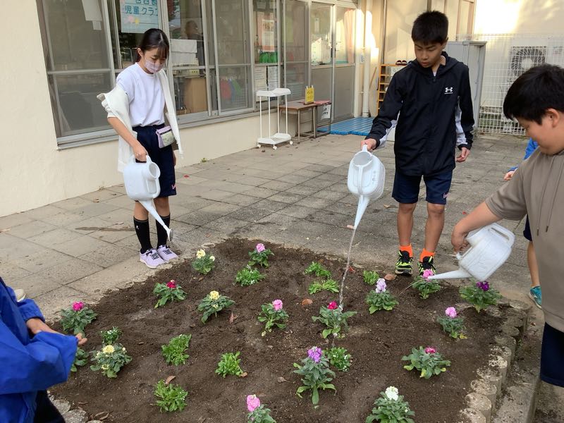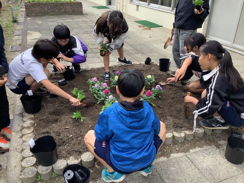 みんなが持ってきてくれた資源回収で得たお金でストックとアリッサムを買い、環境委員が植えてくれました。やさしい色合いの可愛らしい花壇になりました。