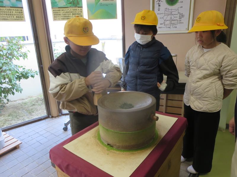 3年生が校外学習にいきました。社会で学習した抹茶の工場では、グリーンティーを味わったり、臼をひかせてもらったりしました。メモをしっかり取ったのでこれからの学習に活かせそうです。