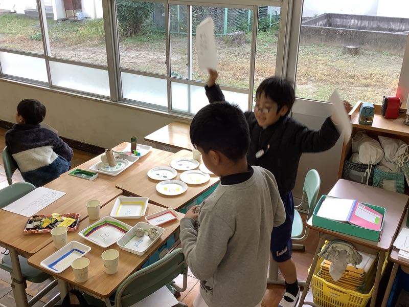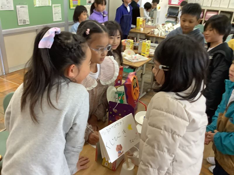 2組は今日、おもちゃパーティーをしました!工夫を重ねて作ったおもちゃで、1年生を招待し、お店を開きました!1年生が喜んでくれて、2年生もとても嬉しそうでした。