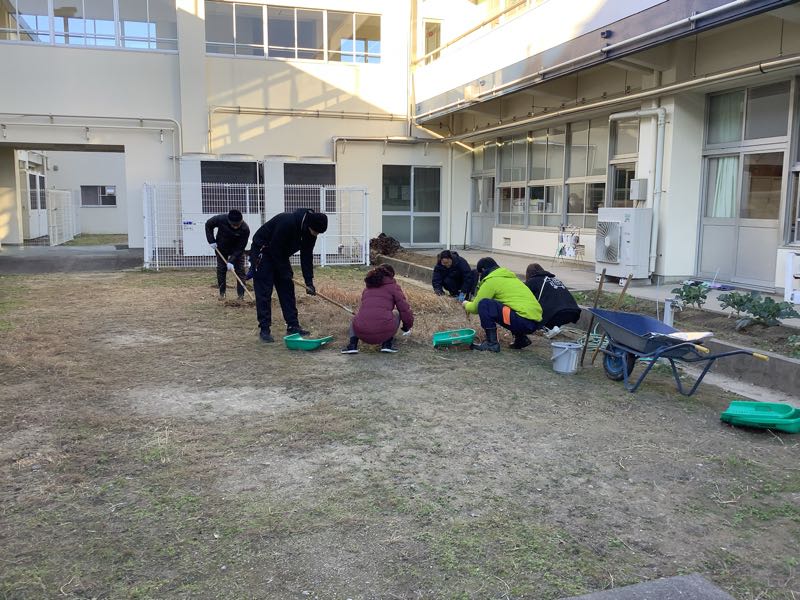 奉仕作業では、2年生教室前の草取りをしました。大きく伸びた草を取りきることができ、すっきりした中庭になりました。