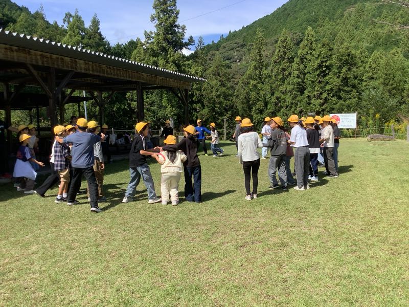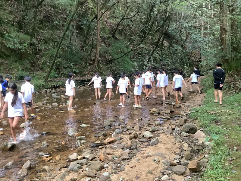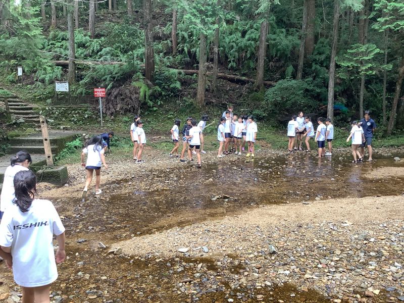 山びこの丘に着いてから、川でネイチャーゲームをしました。班で協力して木や葉を探したり、石積みをしたりしました。