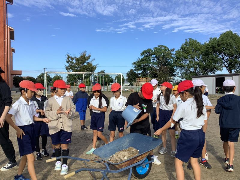 秋晴れの空のもとで、5年生が稲刈りをしました。腰をかがめて稲を刈る体験をして、米作りの大変さを実感していました。